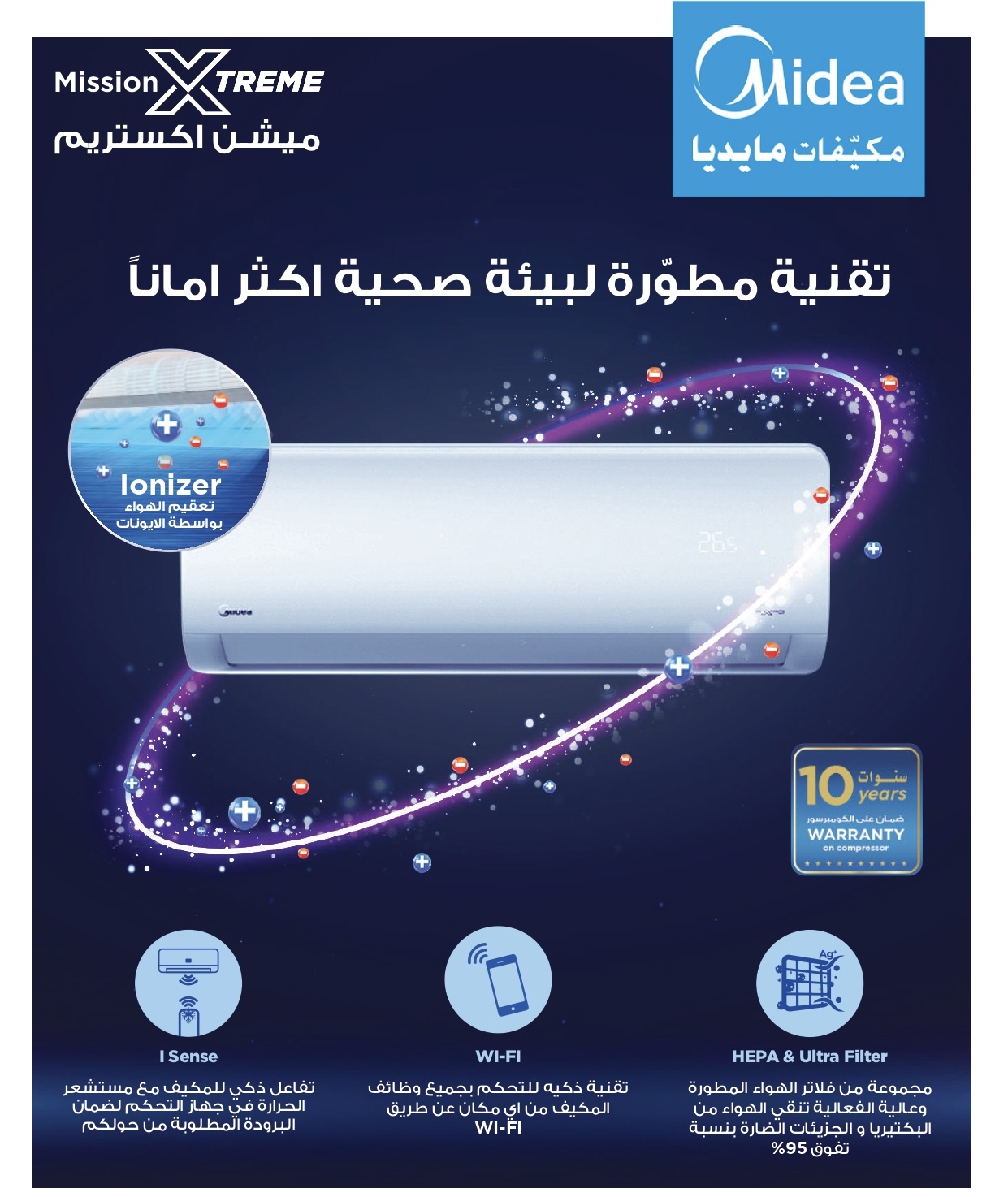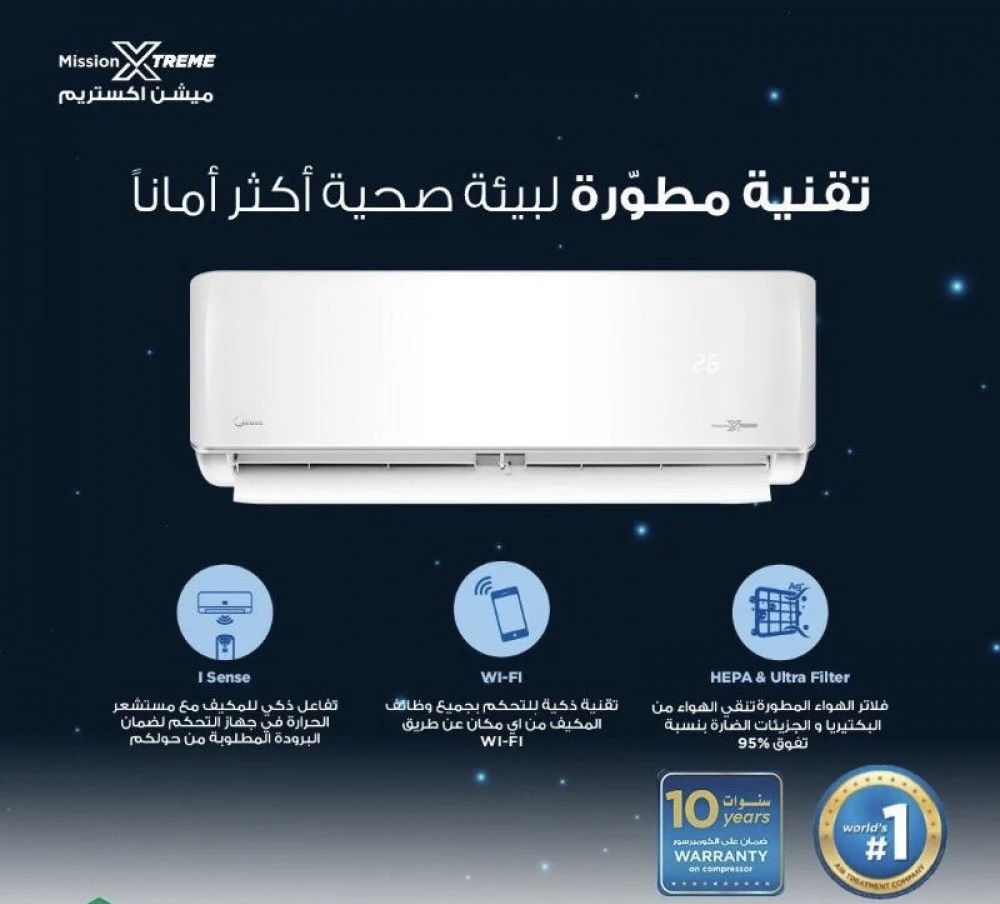 مكيف ميديا سبليت ميشن اكستريم 18100 وحدة هو مكيف هواء حار وبارد يوفر تبريدًا وتدفئة عالية الكفاءة. يتميز بتقنيات مثل خاصية I Sense، وواي فاي، وتنقية الهواء باستخدام فلاتر هيبا وبلازما، وغاز التبريد R410A الصديق للبيئة. كما يحتوي على ميزات أخرى مثل إعادة التشغيل التلقائي، وخاصية الكشف عن تسريب المبرد، وصندوق كهربائي مقاوم للحريق.